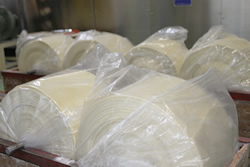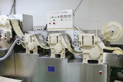 切出し後の麺線を、スポットクーラーで冷却したあとにカットし重量を決め製玉ラインで丸め整形し、袋詰めします。