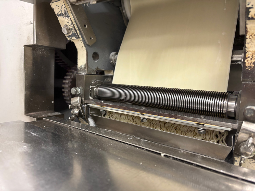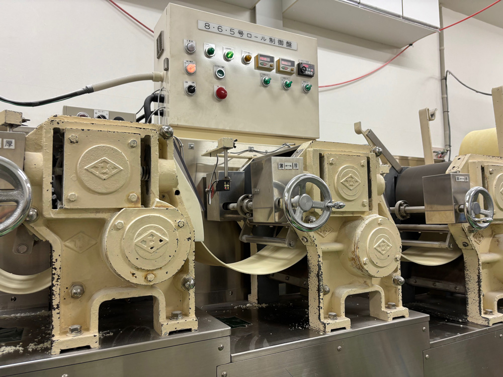 圧延された麺帯は、仕上げロールで所定の厚みに調整し、切刃によって麺線にカットされます 。