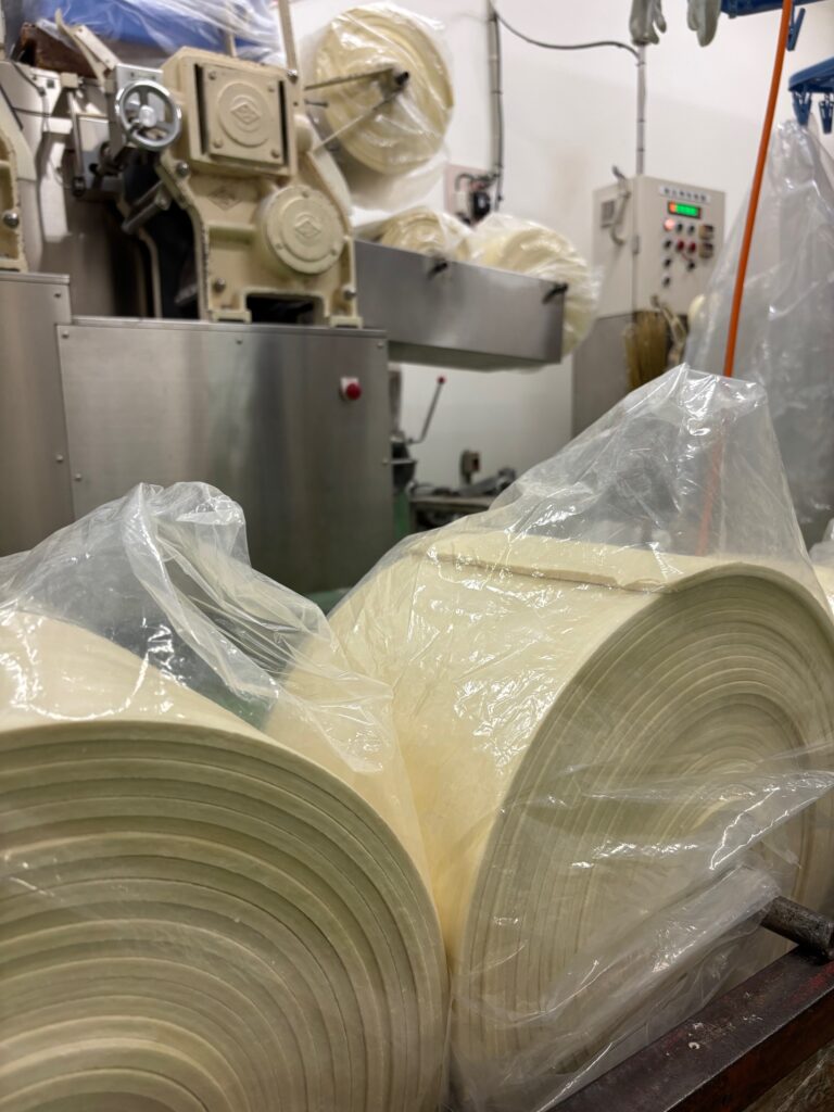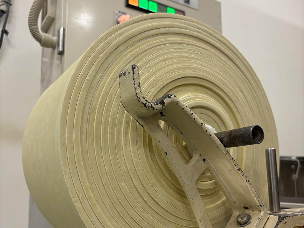 この工程により麺帯は柔軟性を取り戻し、次の圧延工程にスムーズに入れるようになります。